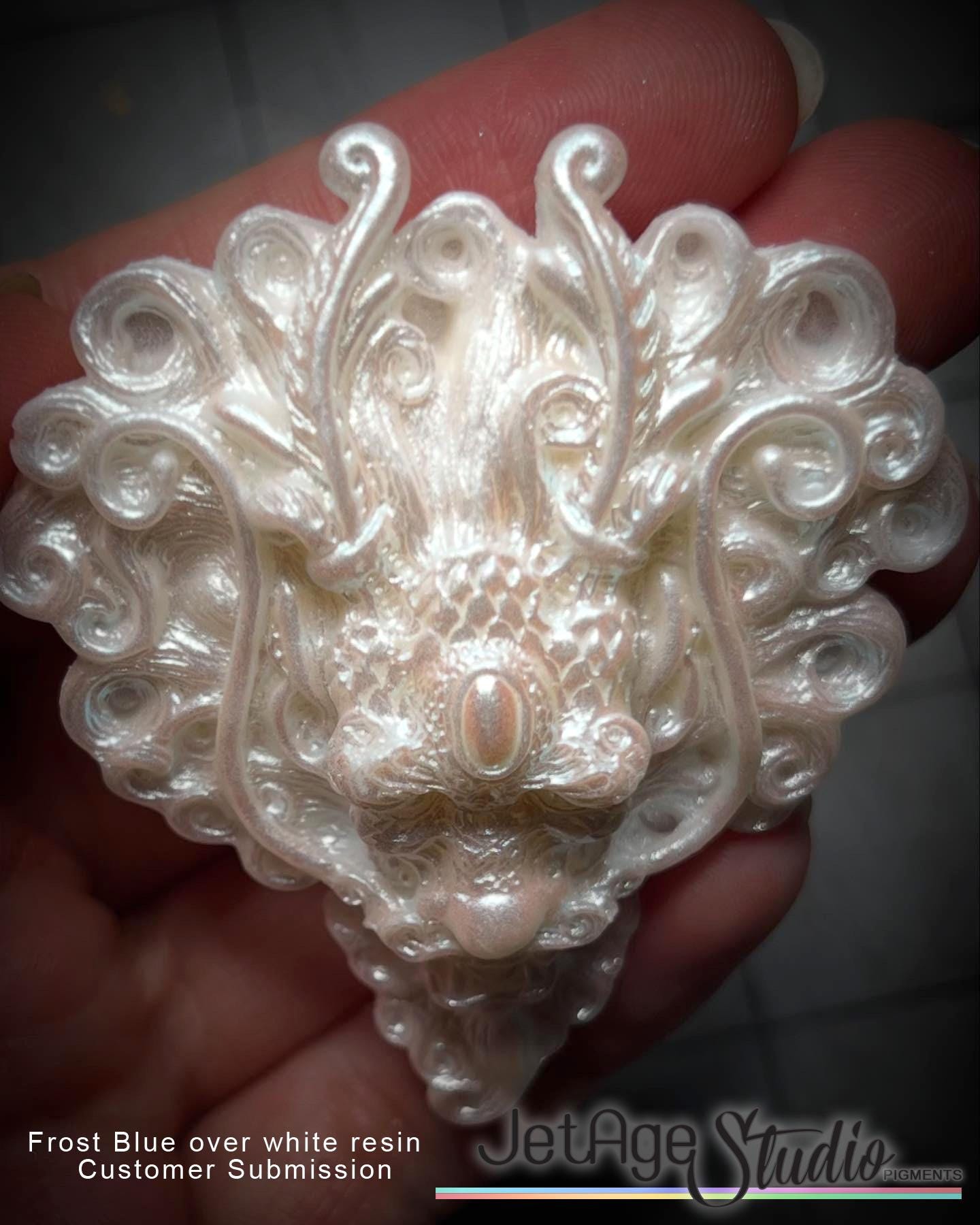 "Frost Blue" is a fantastic, dramatic ultra fine chameleon powder. It is an intensely pigmented "white based" chameleon that shows its color shifting qualities on dark backgrounds. The round dome sample shown in photos is an effect created by dusting the silicone mold with Frost Blue, then pouring in black epoxy resin and cured. Video clip features cast resin work by Tanya @resinatebr using Frost Blue Chrome over a mica white resin to create a cool pearl-like effect on the surface. Endless application possibilities!