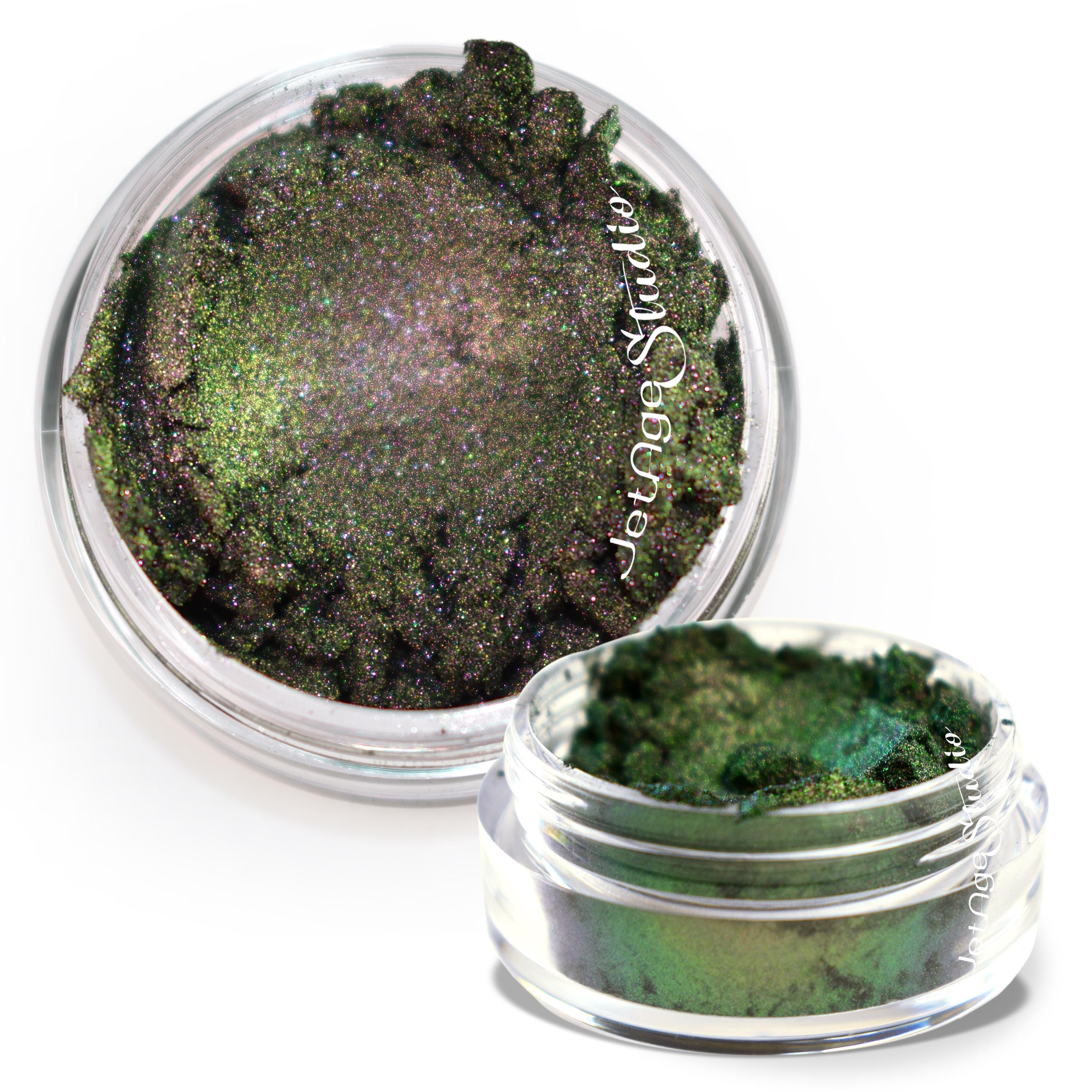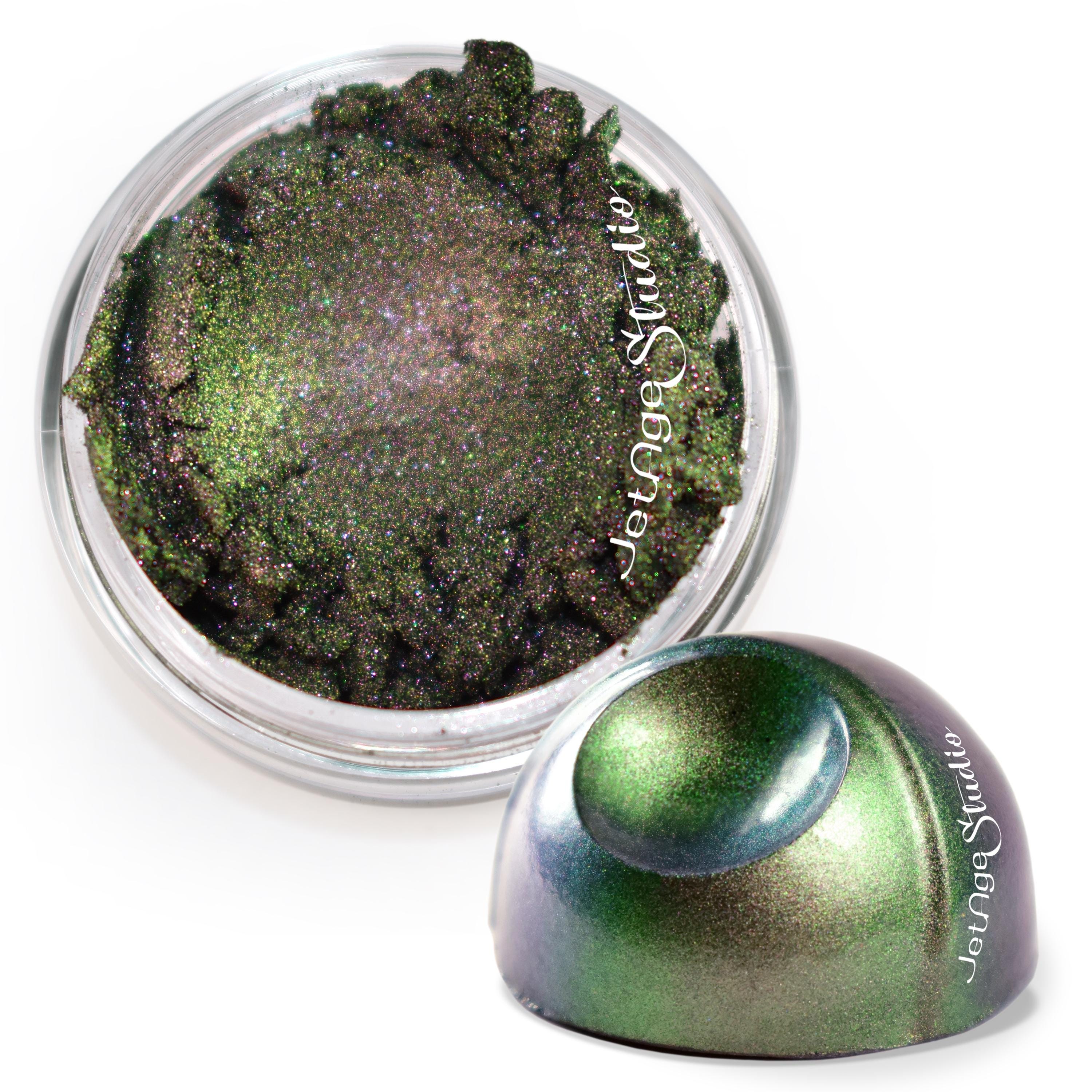 "Villain" - NEW! This amazing Intense Chameleon Chrome powder is in the same family as "Wicked" and "Juniper" but totally unique itself. "Villain" is more army green than "Wicked" but less pink, but It is more pink than "Juniper"! Intense chameleon powders (formerly called "ultra fine chameleon series"), are super pigmented OPAQUE chameleon powders that can create a chrome-like finish when burnished over prepped finger nails or other lightly tacky surfaces. This powder is a super fine mesh. Pigments can be mixed into most oil or acrylic based mediums and are solvent resistant in nail gel mediums, and can be mixed into cosmetic formulas. This super velvety fine powder can be applied directly to silicone molds with a small brush for surface embellishment in resin work, or on the surface of polymer clays like the examples show (round resin sample). This pigment series is best applied over DARK backgrounds. Check out the whole series in our Intense Chameleon Chrome powders section!